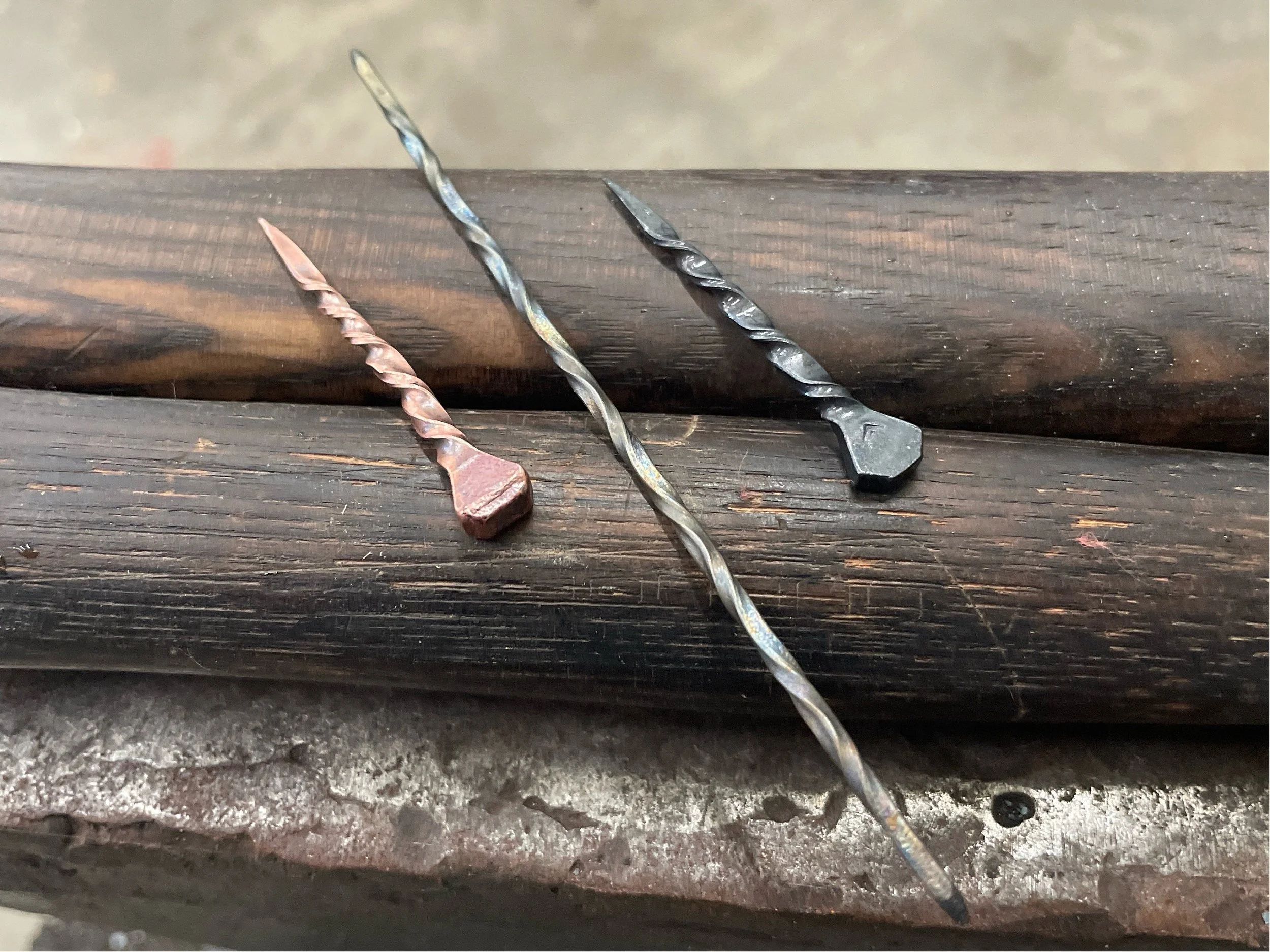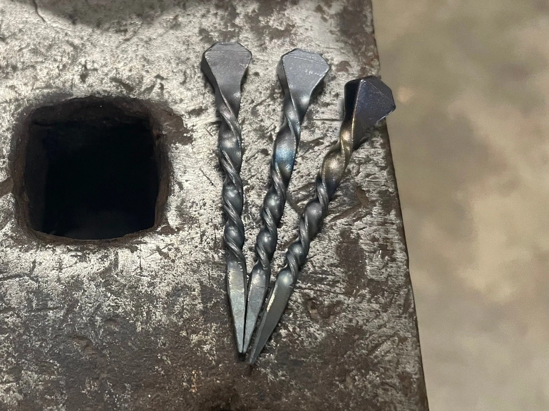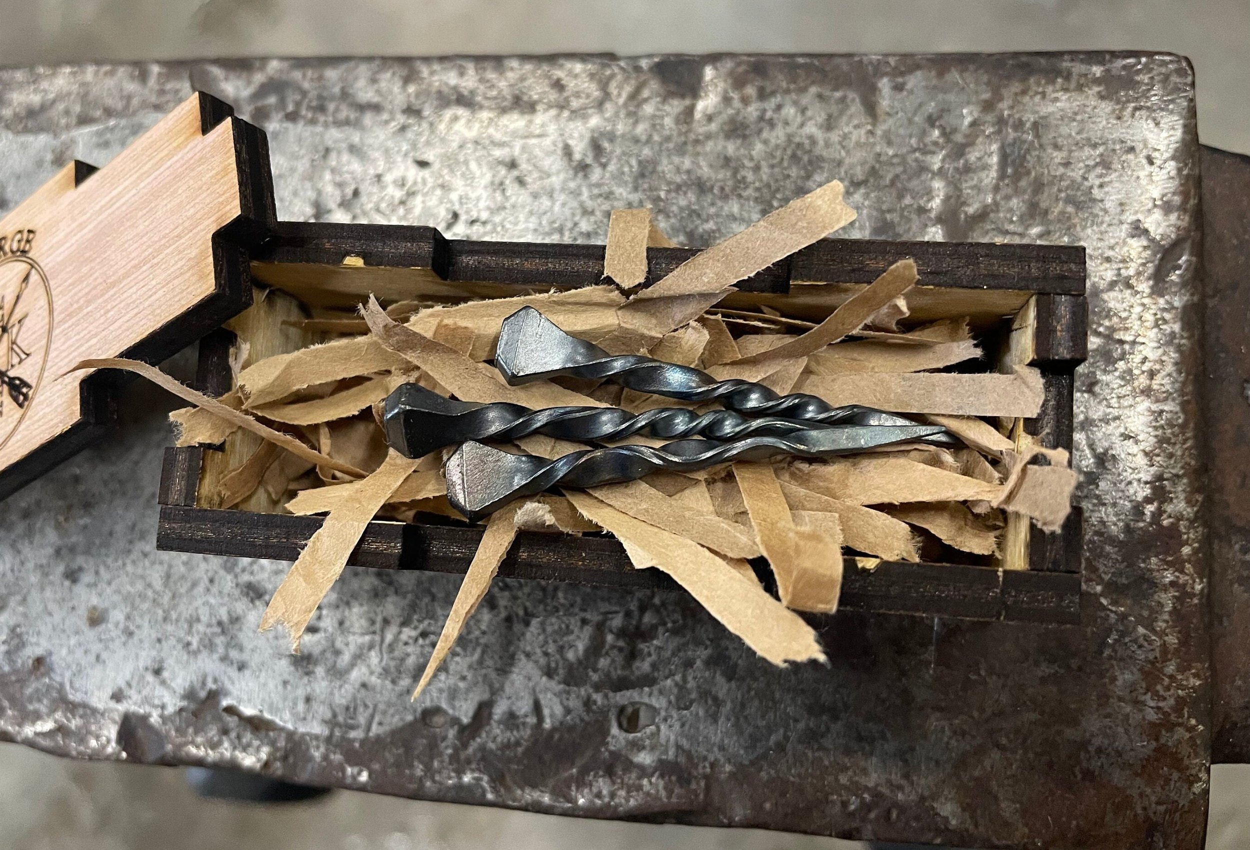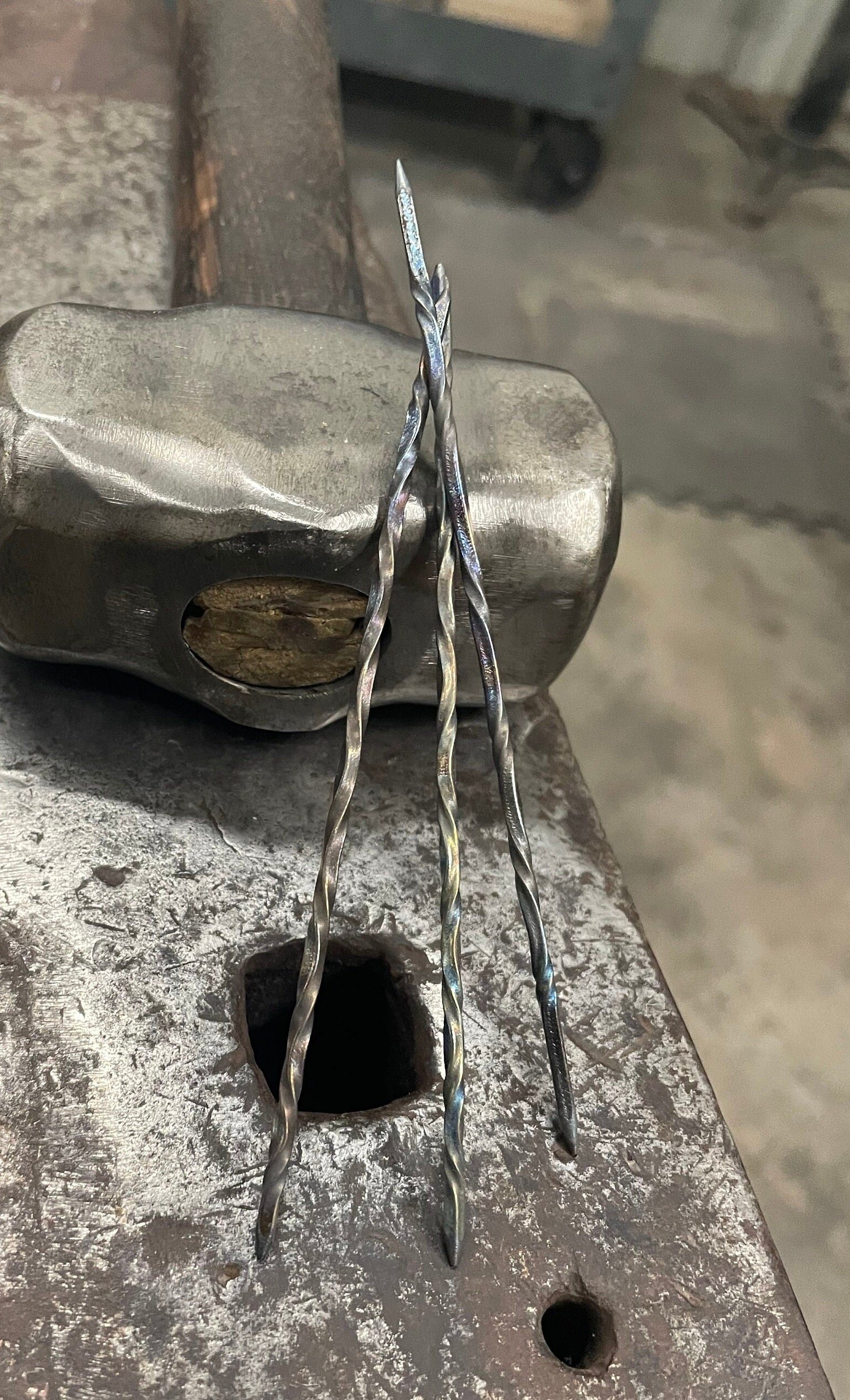 These are hand forged, so each pattern, length, and coloration may vary from piece to piece. These are metal pieces, and care must be taken to ensure their longevity as corrosion can occur if not taken care of. Treat them as you would cast iron: oil regularly and limit exposure to moisture for prolonged periods.