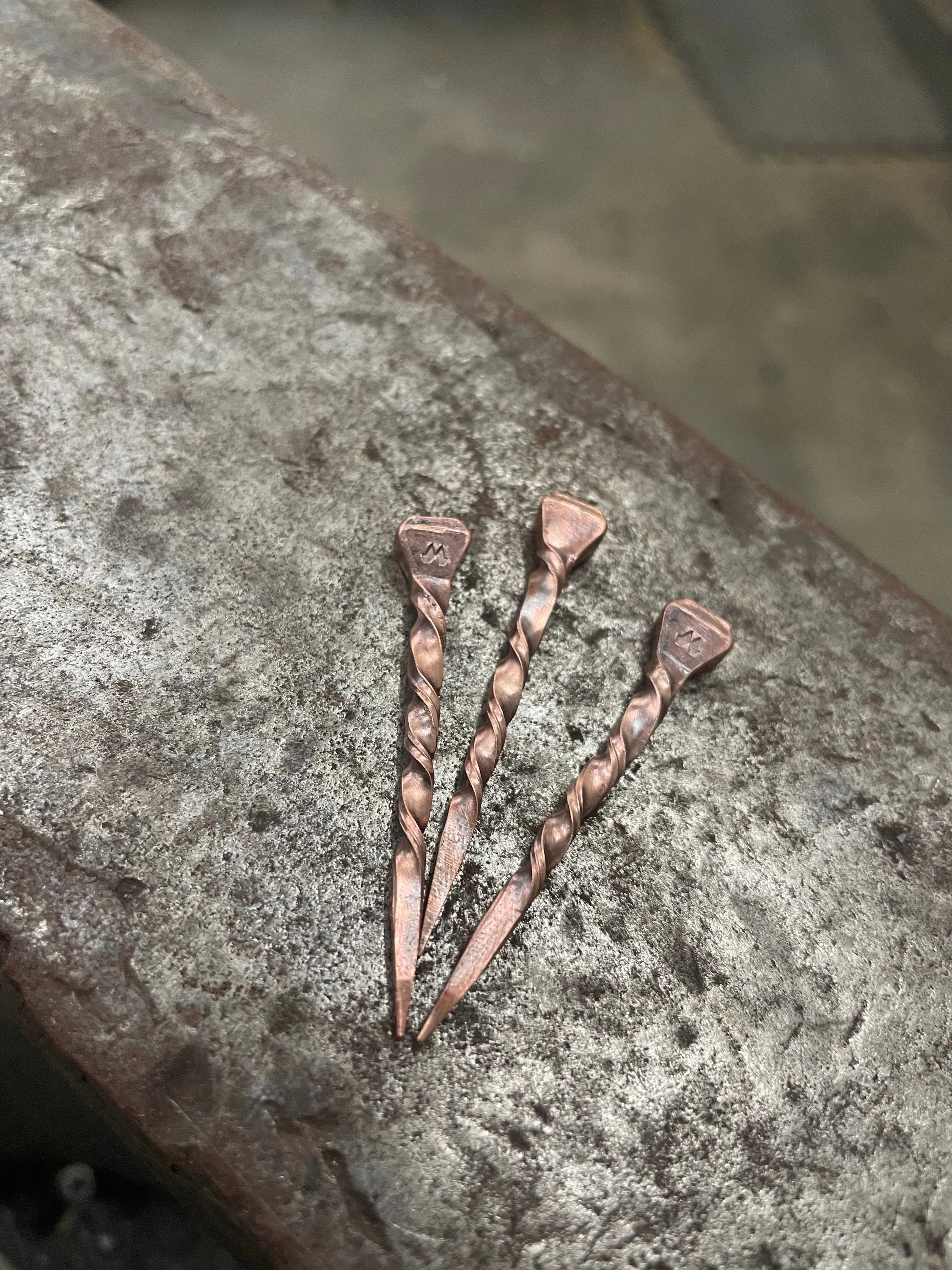 We got 'em in 2 styles: Horseshoe nail ( HS ) or Cowboy toothpick. *The horseshoe nail has 2 variations: regular & copper. Horseshoe nails are #5 nails measuring in at around 2 inches long. *The Cowboy toothpicks are stainless steel & come in reverse twist measuring around 4 3/4 inches.