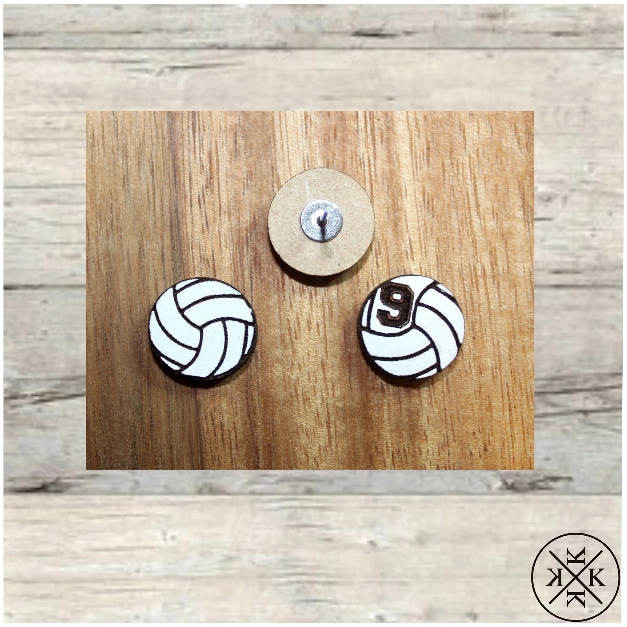 Personalizable volleyball wooden stud earrings laser engraved on lightweight 1/8" wood for comfortable wear. Optional personalization with your/your player's number on both earrings. Earrings are hand painted and sealed with a matte finish sealer. The posts are hypoallergenic stainless steel with pushback butterfly closures. Handcrafted in Colorado.