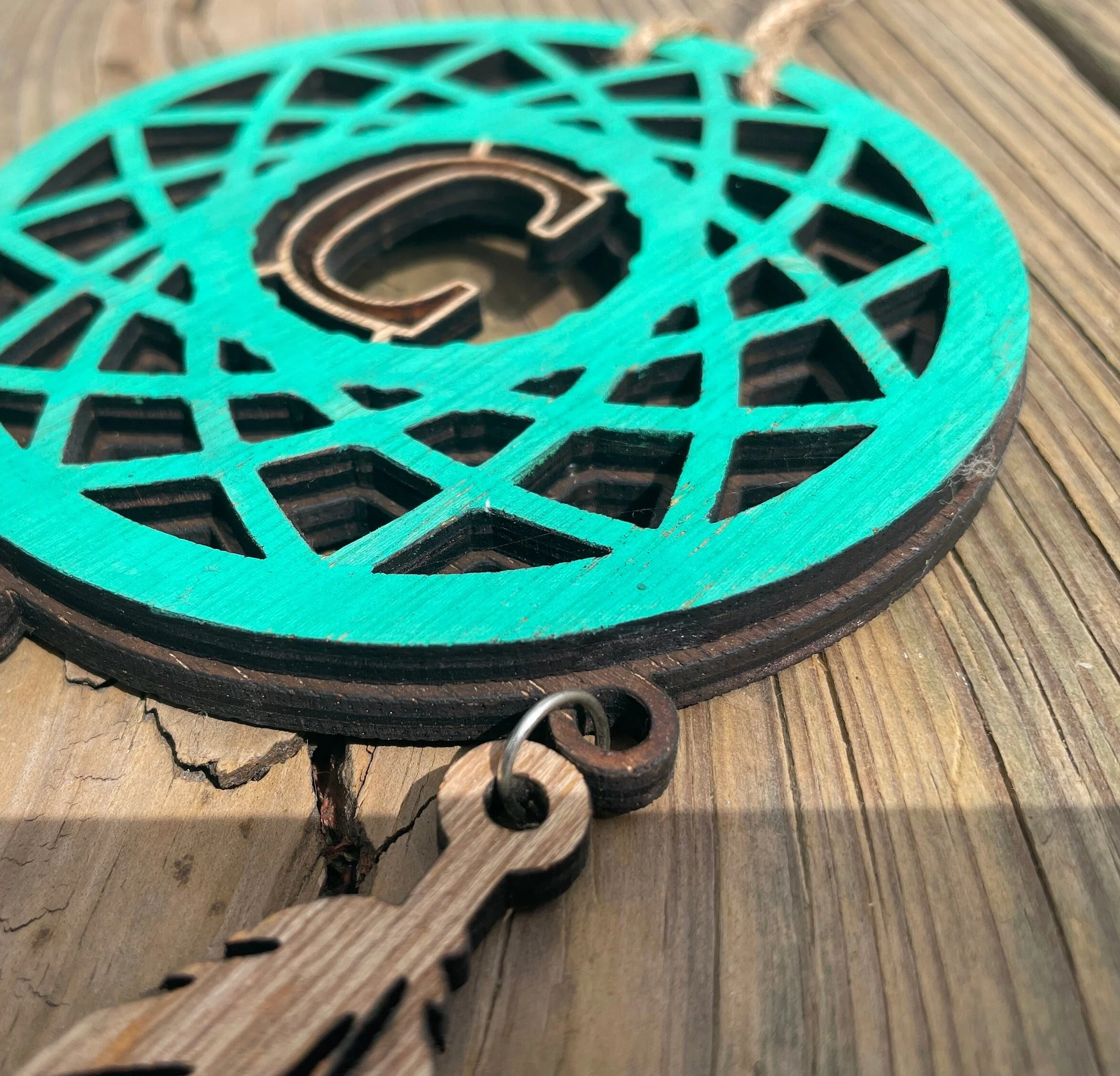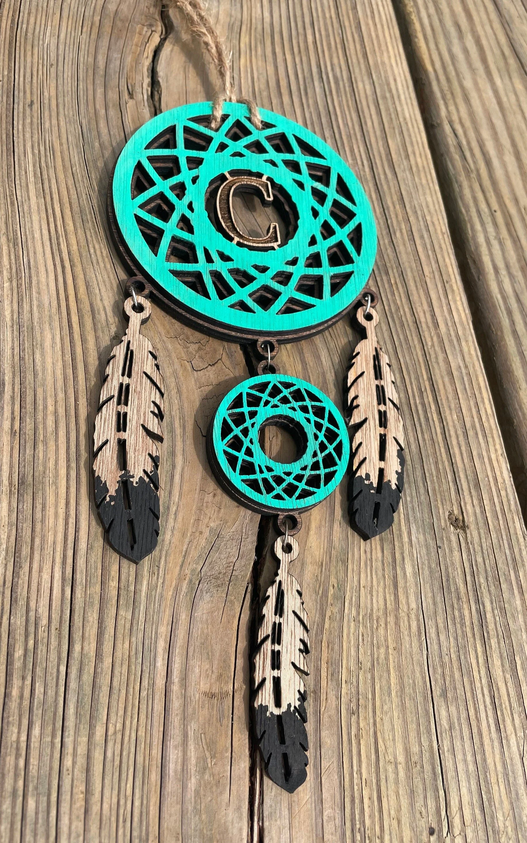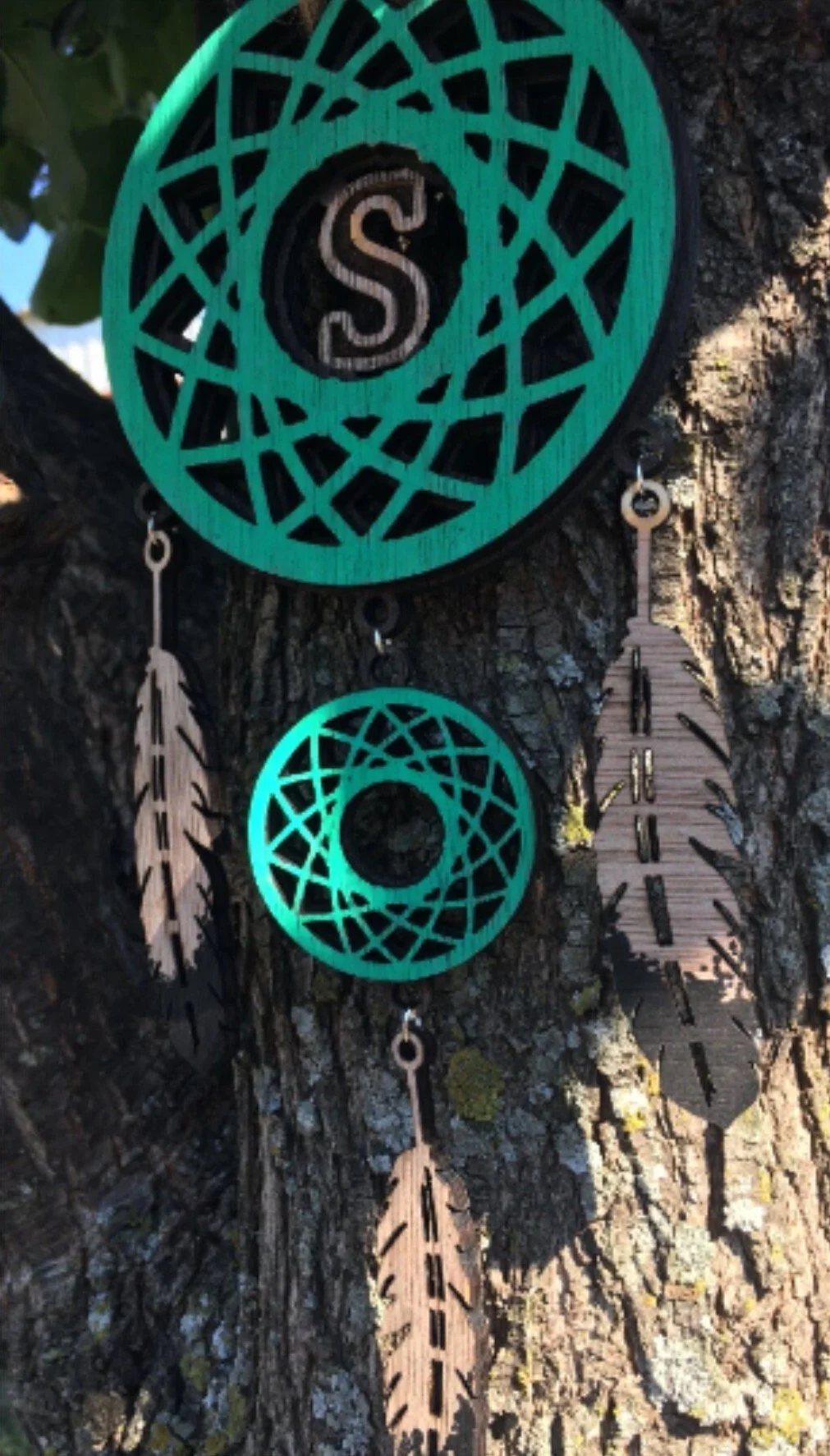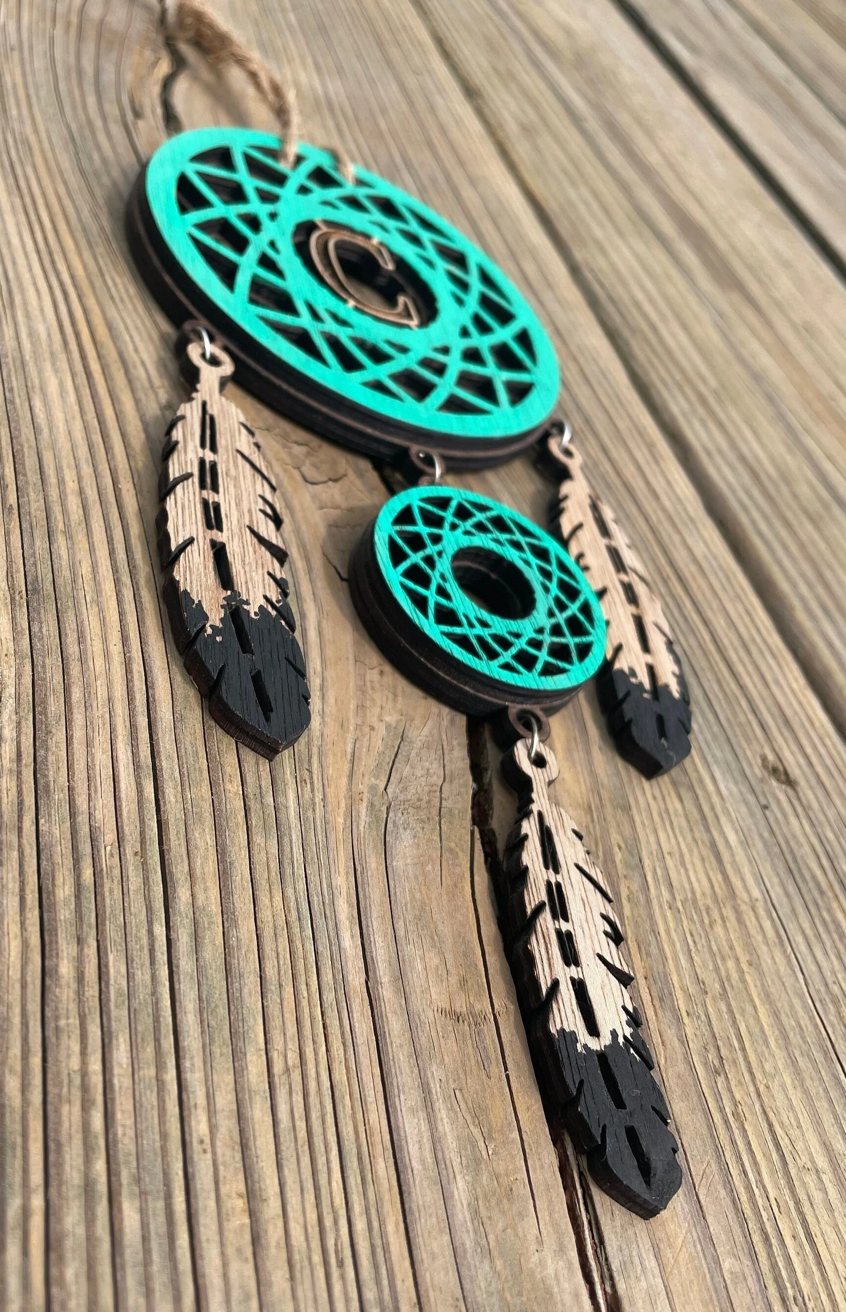 Laser cut & engraved wooden dream catcher. Layered 3-D design with free hanging feathers and mini catcher (see video for movement). Personalized with the initial of your last name. Piece is hand painted, stained and sealed. Measures approximately 11 inches in length, 4.75 inches wide, feathers 3 to 4 inches long. Great gift for home, the office, car mirror hanger, etc. Handcrafted in beautiful Colorado by a registered Native American Choctaw Artist.
