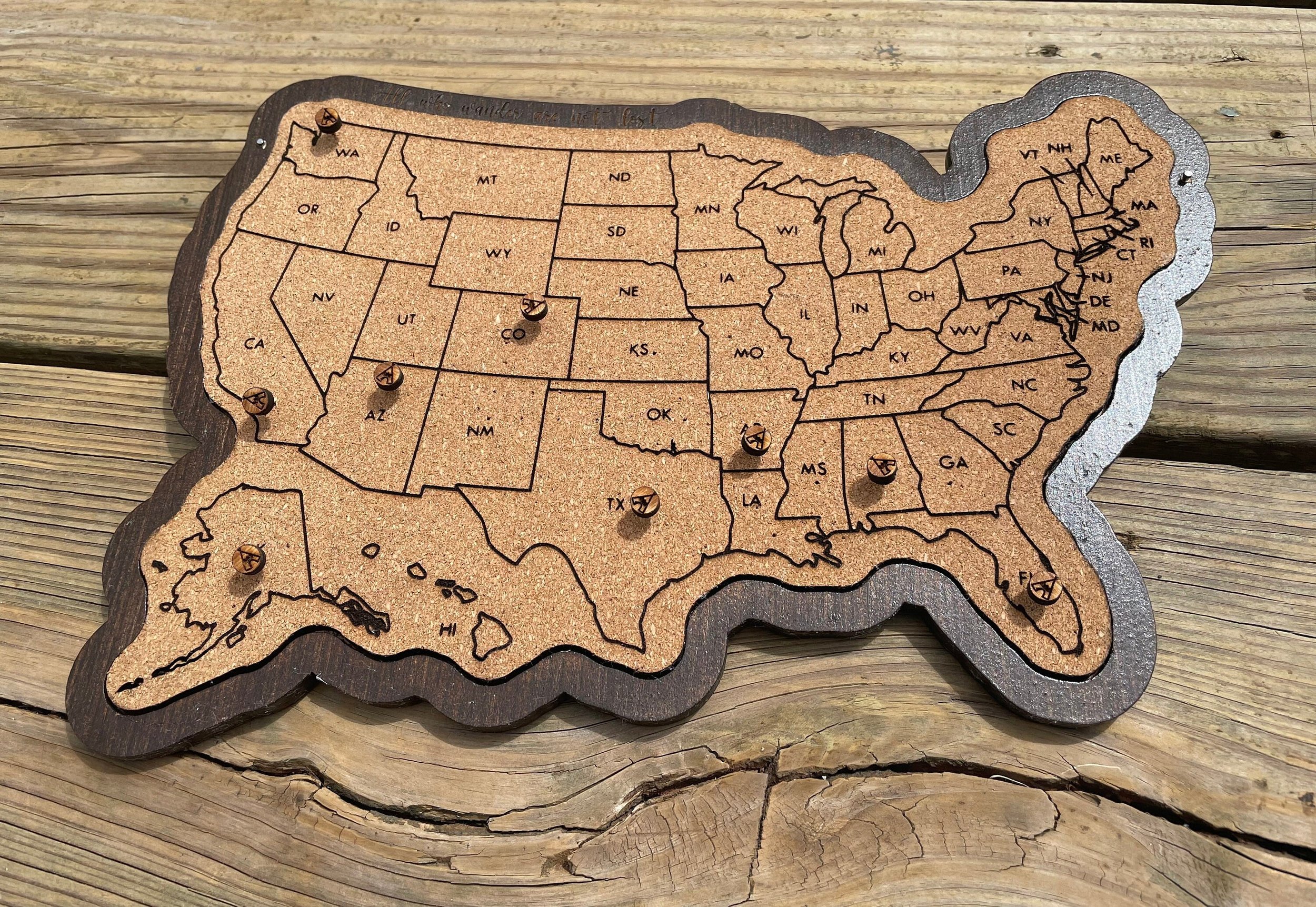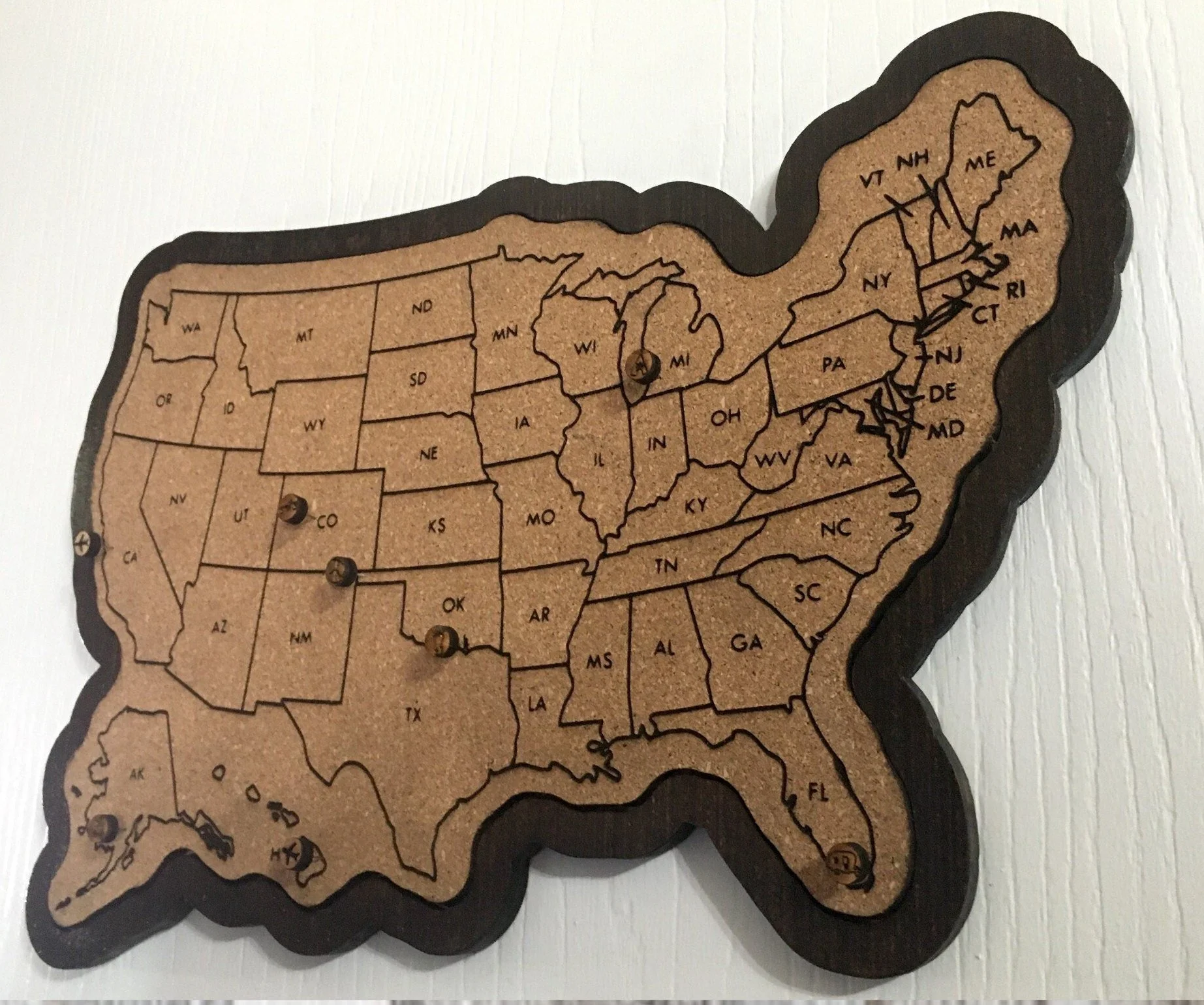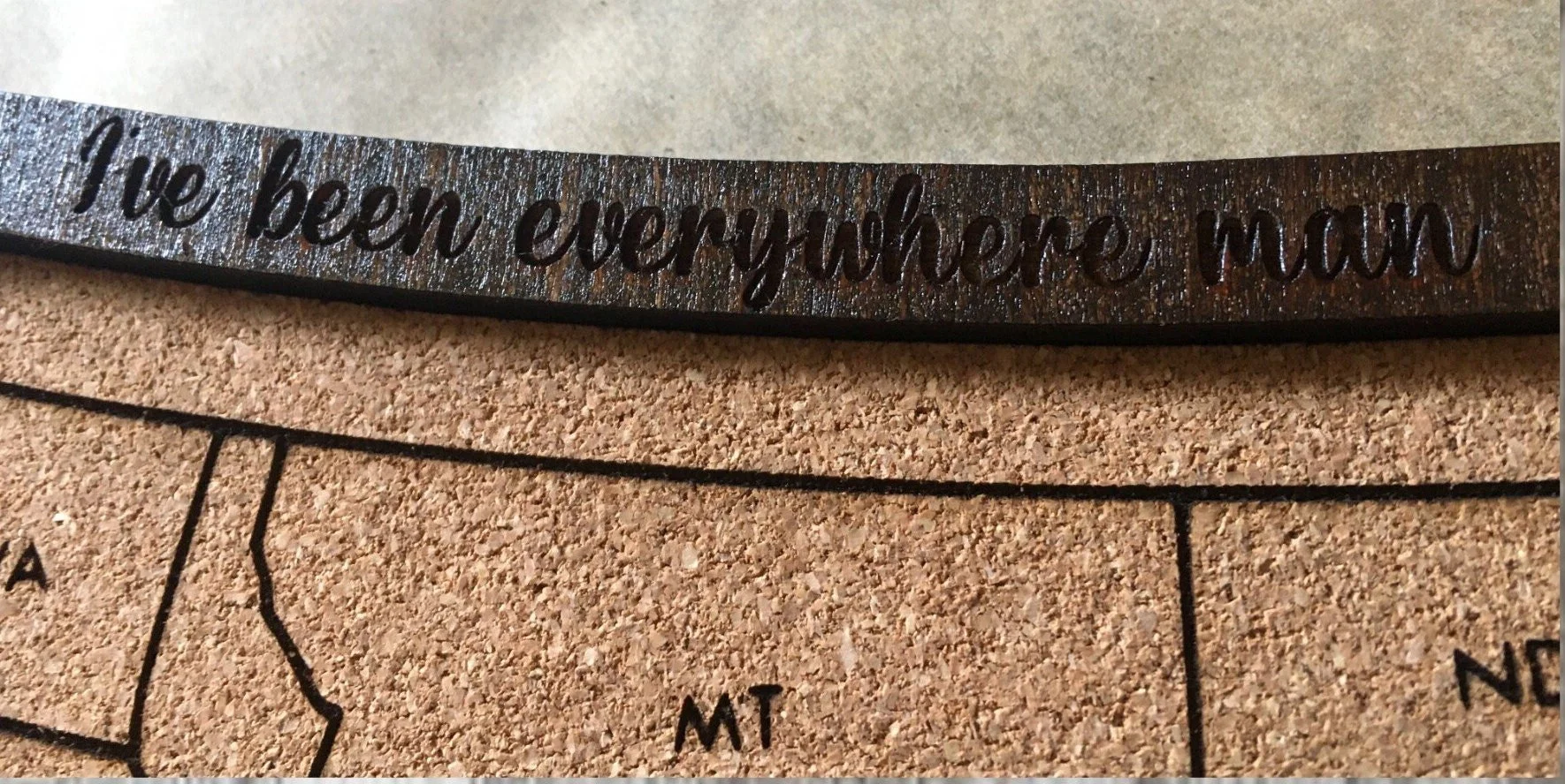 Travel push pin cork board laser engraved map of the United States. Stained & sealed wood board with cork center engraved with 50 states. Choose from plain, or 2 travel quotes, engraved on the upper north western border. "I've been everywhere man", or "All those who wander are not lost", or add your own phrase, name, last name, or family travel slogan, etc. Board measures 15 inches x 10.5 inches x almost 1/2 inch thick. Comes with standard sawtooth picture hanger. *limited space for custom phrase, space is 5 1/2 inches long & just under 1/2 inch tall. Limited to last names or short phrases.