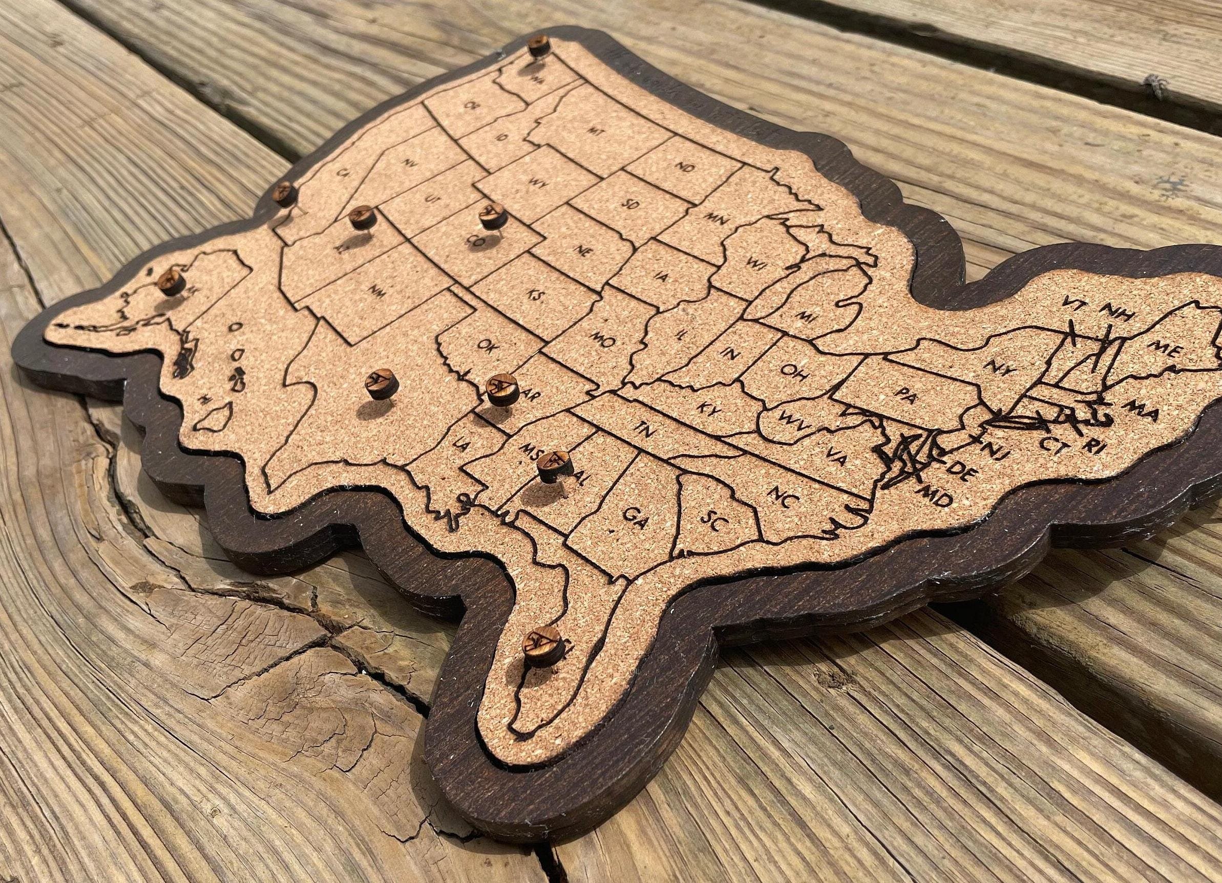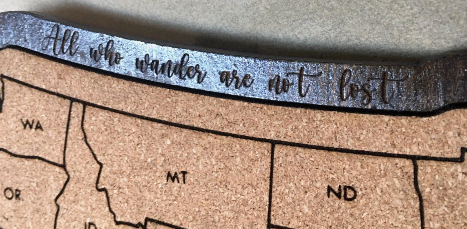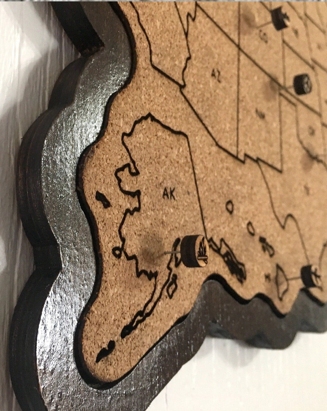 Travel push pin cork board laser engraved map of the United States. Stained & sealed wood board with cork center engraved with 50 states. Choose from plain, or 2 travel quotes, engraved on the upper north western border. "I've been everywhere man", or "All those who wander are not lost", or add your own phrase, name, last name, or family travel slogan, etc. Board measures 15 inches x 10.5 inches x almost 1/2 inch thick. Comes with standard sawtooth picture hanger. *limited space for custom phrase, space is 5 1/2 inches long & just under 1/2 inch tall. Limited to last names or short phrases.